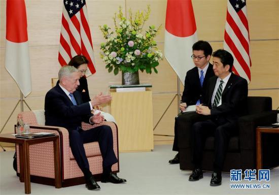 2月3日,在東京,日本首相安倍晉三(右前)與到訪的美國國防部長馬蒂斯(左前)舉行會談。