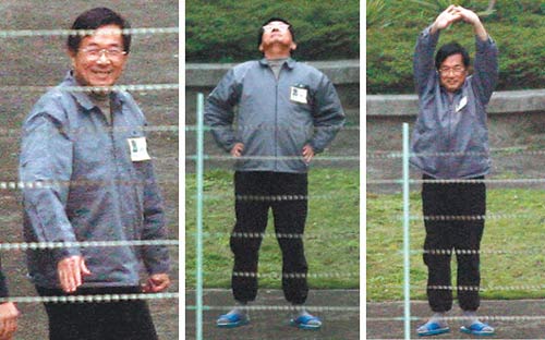 12日下午,陳水扁在臺北看守所放風運動,他雙手叉腰,身體向后伸展,還沖著在附近大樓樓頂守候的記者笑,好像要擺姿勢給記者拍照。