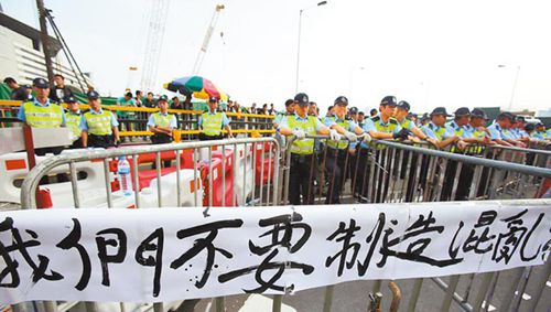 10月1日,占中人士匯集金紫荊廣場外圍,有民眾拉起“我們不要制造混亂”的布條。(中新社)