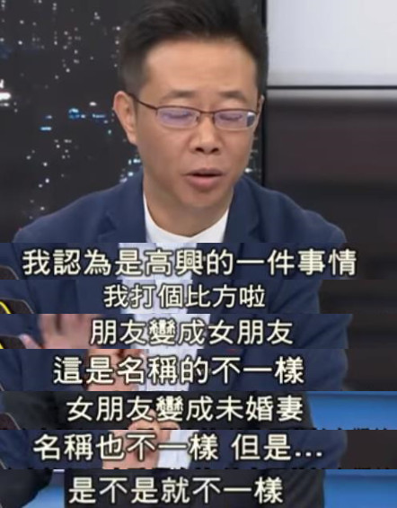 臺灣政論節(jié)目《少康戰(zhàn)情室》中,民進(jìn)黨“立委”張宏陸就此事欣喜表示,這次改名字是個高興事兒。為了論證自己的結(jié)論,張進(jìn)行了這樣一番闡述:你看,朋友變女朋友,名稱不一樣!女朋友變未婚妻,名稱也不一樣!是不是親密度就不一樣了!
