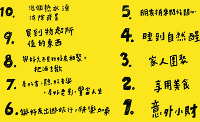 今年,兩岸的社會(huì)情緒“步調(diào)一致”,金秋時(shí)節(jié),大陸流行:你幸福嗎?時(shí)逢歲末,臺灣流行小確幸,兩岸不約而同地對幸福做出思考和解讀。臺灣小確幸的流行源于網(wǎng)絡(luò)上一個(gè)不到2分鐘的短片,短片名為“全民小幸福”,在動(dòng)感的背景音樂中,幾個(gè)快速的畫面配上一句結(jié)語,總結(jié)了10個(gè)小確幸,按順序?yàn)椋喊l(fā)個(gè)小財(cái);享用美食;家人團(tuán)聚;睡到自然醒;朋友捎來問候;與好友出游旅行;看好書,聽好音樂,看好電影;好久不見的朋友把酒言歡;買到物超所值的東西;累了一天泡個(gè)澡……