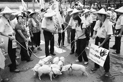 臺灣豬農曾多次“擊退”過美國豬肉的進口,這是2007年的抗議場景。(資料圖片)