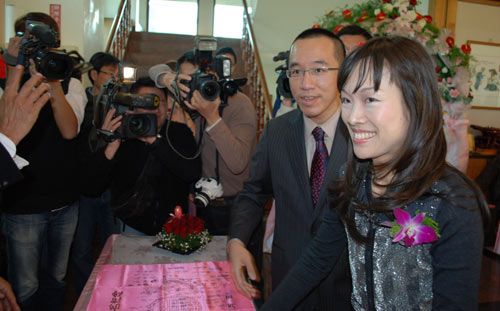 陳水扁兒子陳致中(右2)和妻子黃睿靚(右1)出席妻舅黃漢強(qiáng)的婚禮。圖片來源:臺灣“中央社”