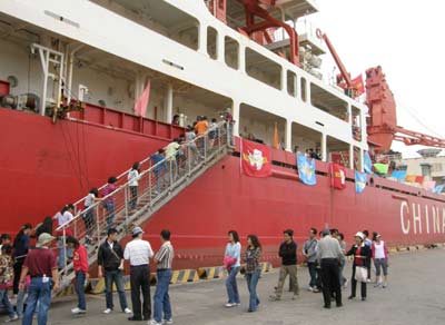 大陸破冰船“雪龍?zhí)枴?月1日停靠高雄港。圖為民眾參觀場(chǎng)景。