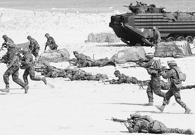3月29日,在韓國慶尚北道浦項,士兵在進行登陸演習。“禿鷲”韓美聯合野外機動演習于3月1日開始,到4月30日結束。新華社發