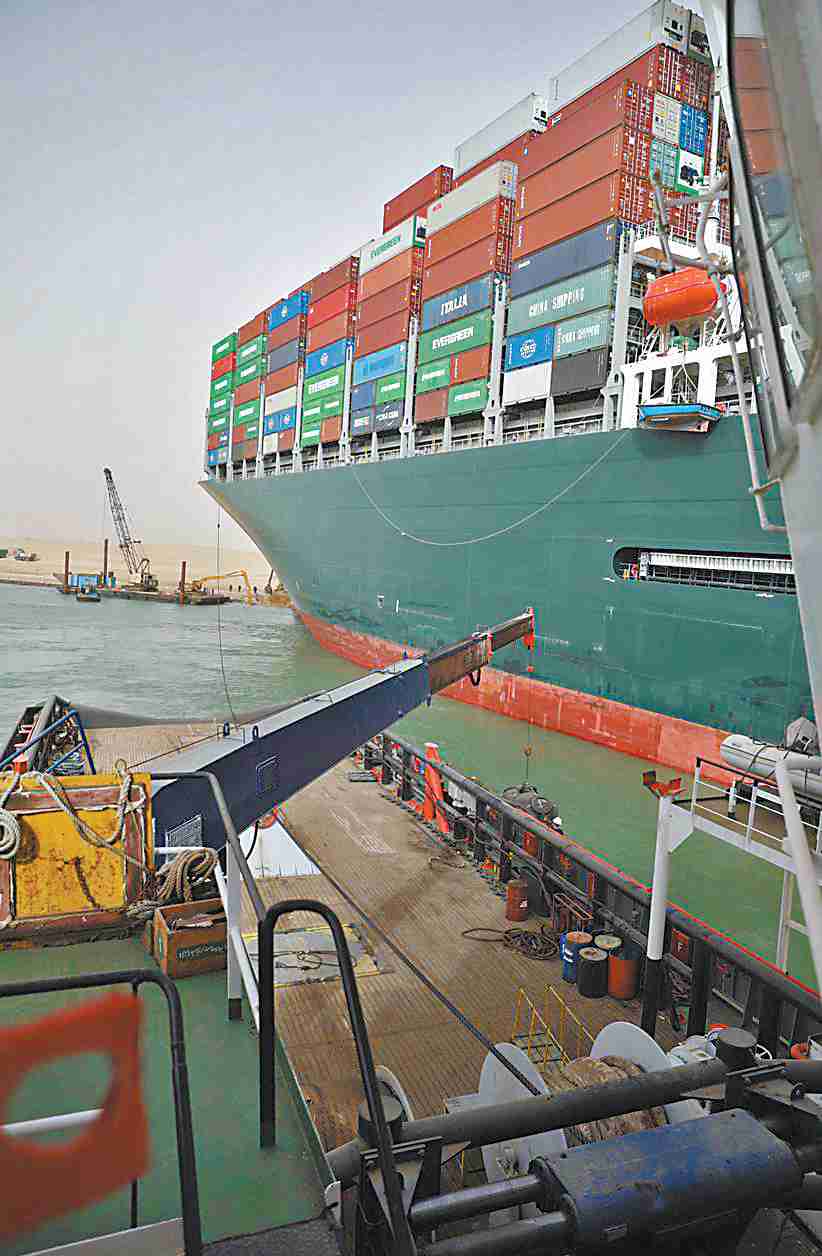 當(dāng)?shù)貢r間25日,多艘拖船正努力對“長賜”號貨輪進(jìn)行救援。