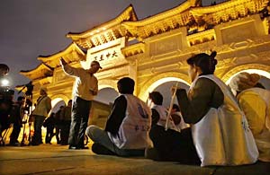 第三社會(huì)黨發(fā)起人周奕成(坐地左一)等成員組成“維和部隊(duì)”在晚間到“大中至正”門靜坐,呼吁停止政治惡斗,暫停拆除。(圖片來源:中時(shí)電子報(bào) 姚志平攝)
