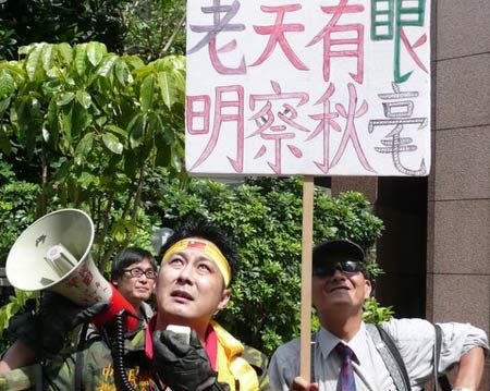 2名男子日前手持標(biāo)語和擴音器專程嗆扁,抗議陳水扁A錢。