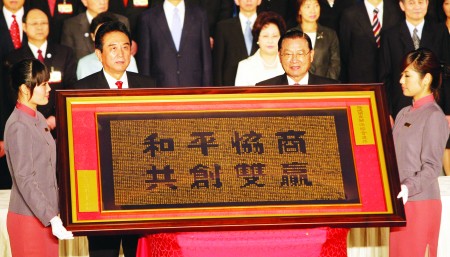 11月4日陳江會談后,江丙坤向陳云林贈送了一幅書寫著“和平協商、共創雙贏”的鏤空書法。