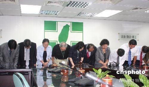 迫于島內公眾壓力,陳水扁8月15日下午發表書面聲明表示其夫婦退出民進黨。民進黨傍晚召開臨時中常會,會后黨主席蔡英文宣讀聲明稿,表示接受陳水扁夫婦退黨,并帶領所有民進黨中常委透過媒體向臺灣公眾鞠躬道歉。(圖片來源:中新社)