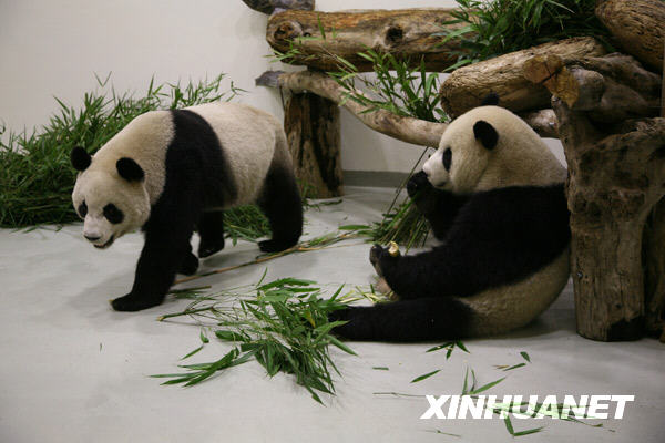 12月23日,團團、圓圓正在進食,這是它們抵達臺灣以后的第一頓正餐,食用的是隨機運抵的四川竹子,還有園方精心準備的臺灣產桂竹、蘋果、窩窩頭等。(圖片來源:新華網)