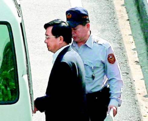 臺(tái)北地方法院審理“公務(wù)機(jī)要費(fèi)”案,4月28日傳訊前陳水扁辦公室出納陳鎮(zhèn)慧和陳水扁首度對(duì)質(zhì)。陳水扁(左)由法警押解步上警備車(chē)。(網(wǎng)絡(luò)圖)