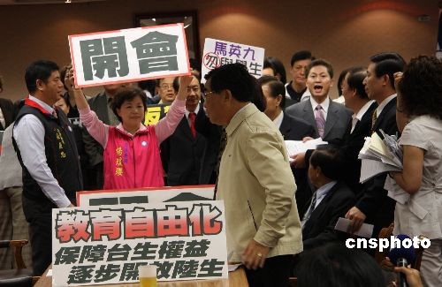 5月4日上午,臺“立法院”原定審查事關大陸學歷認證、開放大陸學生來臺的兩岸人民關系條例部分條文修正草案。圖為民進黨“立委”反鎖會議室、占據主席臺后,國民黨“立委”舉起要求正常開會的標語牌。 中新社發 耿軍 攝