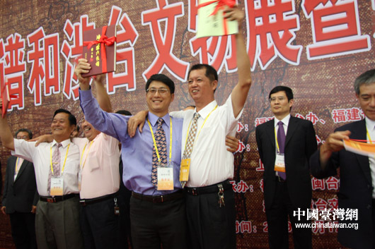 首屆海峽論壇著力于打造兩岸民間交流的平臺,論壇重要活動之一的“閩臺姓氏族譜和涉臺文物展暨宗親懇親會”17日下午開幕。圖為閩臺各十位姓氏宗親代表對接交換族譜,以族譜見證了閩臺割舍不斷的血脈親情。(中國臺灣網(wǎng) 徐麗麟 攝)