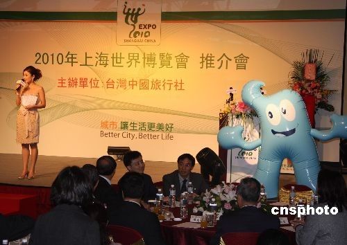 “2010年上海世界博覽會推介會”4月6日在臺北舉行。臺灣“中國旅行社”被宣布成為上海世博會臺灣地區門票的指定代理商,上海世博會的吉祥物“海寶”及票樣亦首次在臺灣亮相。圖為推介會會場。 (圖片來源:中新社)