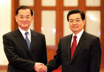 2005年4月29日下午3時(shí),中共中央總書記胡錦濤與中國國民黨主席連戰(zhàn)那一次歷史性的握手。(來源:新華網(wǎng))