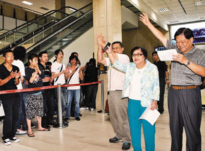 赴大陸參加兩岸論壇的許榮淑、范振宗7月19日返臺(tái),在機(jī)場(chǎng)受到支持者的熱烈歡迎。