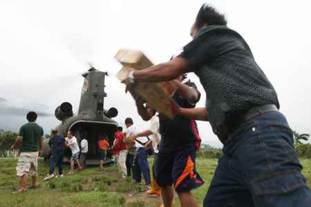莫拉克臺風引發大水重創南臺灣,臺軍“空特部”13日運送300架次物資至災區,圖為寶來村民接力遞送空投物資。