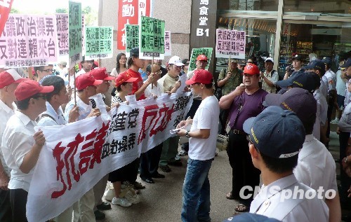 8月29日,勞動黨等10余個臺灣民間團體前往臺北的民進黨中央黨部,抗議該黨為政治利益、操弄達賴赴臺一事。圖為當天上午,勞動黨、中國統一聯盟等各團體近百位人士在北平西路民進黨中央黨部所在大樓前舉起“救災重建優先、政治操弄可恥”、“臺獨加藏獨,破壞兩岸和平”等標語牌,進行抗議活動,現場有警察維持秩序。(圖片來源:中新社)
