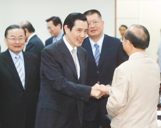 馬英九(中)兼任國民黨主席后首次主持中常會,會前他和中常委一一握手。(圖片來源:臺灣聯合新聞網)