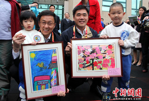 4月7日下午,上海市長韓正與臺北幼兒園小朋友親切互動,獲贈5歲小朋友的畫作《美麗天空繽紛童年》。圖右為臺北市長郝龍斌,他獲贈的作品是《花樣活力繽紛童年》。(圖片來源:中新網)