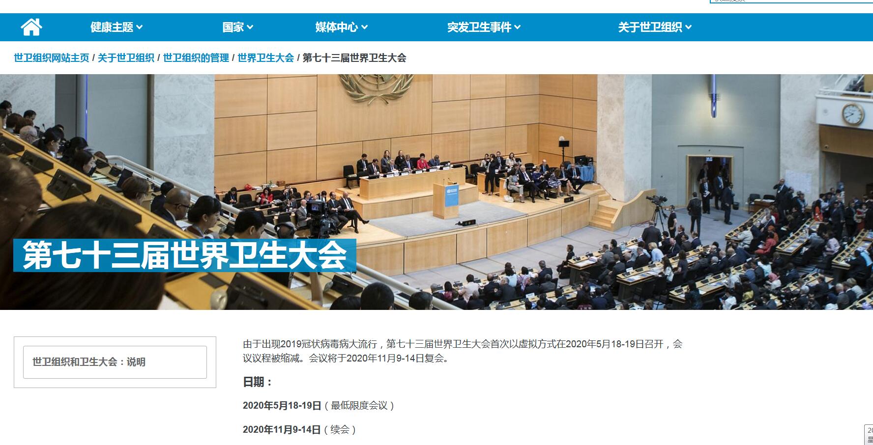 今年,受新冠肺炎疫情影響,第七十三屆世界衛生大會首次以虛擬方式在2020年5月18日、19日召開,會議議程被縮減。根據世衛組織安排,世衛大會將于11月9日至14日復會。