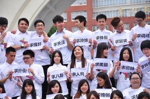 我們不妨通過照片解讀一下這些“天之驕子”在內(nèi)心深處的表白,一個男孩子也敢于高舉“求強(qiáng)奸”的橫幅躋身于一群同處幾年的異性之中。或許我們可以認(rèn)為他是校園的愛情的失敗者,在面對成雙入對的校園風(fēng)景里他感受到了失落;亦或許是他對于所謂的“高、帥、富”的嫉妒與對真愛的渴求。如今,即便在象牙塔下,校園的愛情也遭受了金錢的侵襲,相對封閉的校園已經(jīng)接受了社會化的融入。