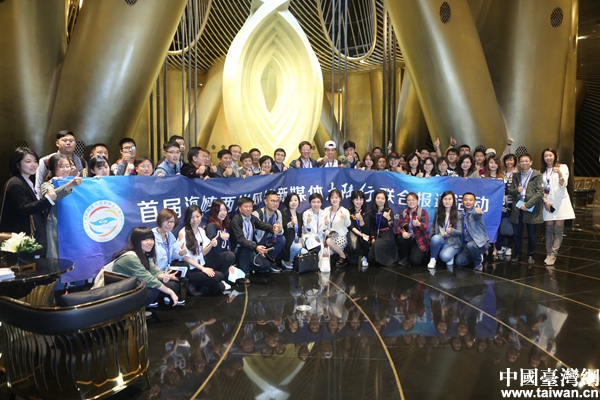 兩岸媒體人在上海中心大廈內(nèi)合影。(中國臺(tái)灣網(wǎng) 陳佳慧 攝)