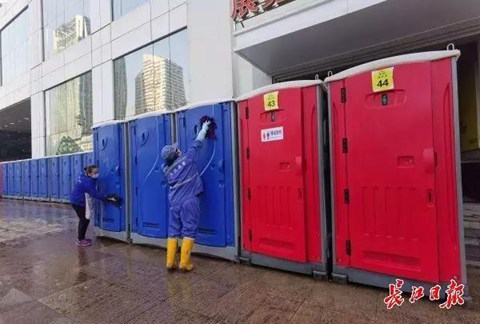 方艙醫院改建自體育館、展覽中心,本身具備衛生設施;為了滿足需求,工作人員還為各個方艙醫院緊急大量安裝移動廁所。(圖片來源:長江日報)