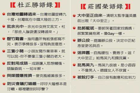 報道稱,杜正勝在高雄主持一個教育局長會議時,心情顯得不錯,一時興起還接過指揮棒,即興指揮學生演奏樂曲。而莊國榮仍是高調的回應,還瞪大眼睛說,“自己在反蔣這一點上永遠堅持到底。”