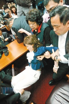 幾番推擠沖突,趙麗云疑似體力不支,昏厥倒地,一旁的國(guó)民黨民代趕緊撐住趙麗云,將趙抬出就醫(yī)。來(lái)源:臺(tái)灣《聯(lián)合晚報(bào)》