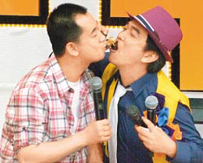 黃海波吃章魚腳,吳宗憲(右)湊過去幫他,差點親到嘴。