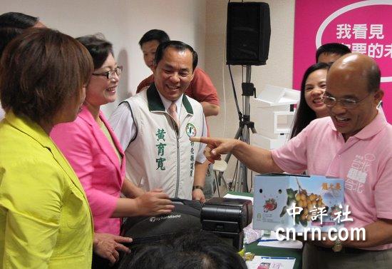 綠議員送上名為“龍之果”的龍眼時,蘇貞昌馬上澄清說“我沒有要當皇帝,我只是要做事”。(圖片來源:中評社)