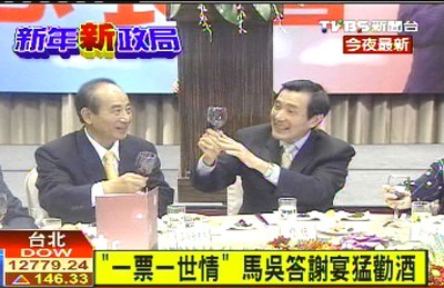 據臺灣TVBS網站報道,馬英九和吳敦義1日晚出席感恩餐會,答謝競選干部在選戰過程中的幫助,馬英九深深三鞠躬表達感激,并說“一張票一世情”。不過,馬吳二人真的太開心,吳敦義在現場猛勸酒,不知道是不是多喝了,馬英九離開餐會的時候,講話變得好輕柔。