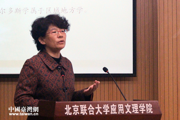 北京聯合大學應用文理學院院長兼北京學研究基地主任張寶秀圍繞“北京學研究新進展”進行主旨演講。(中國臺灣網 張潔 攝)