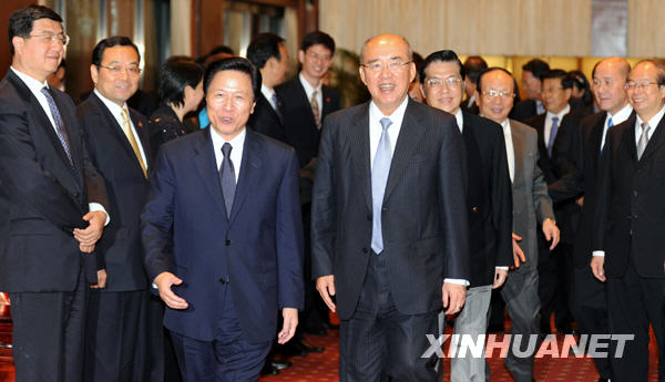 11月9日,中國國民黨榮譽主席吳伯雄(中右)在臺北會見來訪的中共江蘇省委書記梁保華(中左)。(圖片來源:新華社)