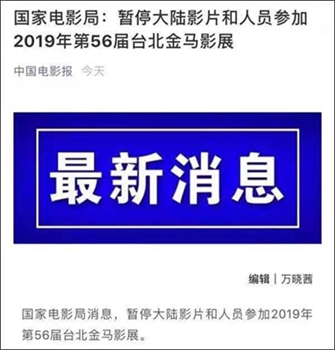 繼不到一周前文旅部公告暫停大陸居民赴臺(tái)個(gè)人游試點(diǎn)之后,國(guó)家電影局今天上午發(fā)布消息,暫停大陸影片和人員參加2019年第56屆臺(tái)北金馬影展。