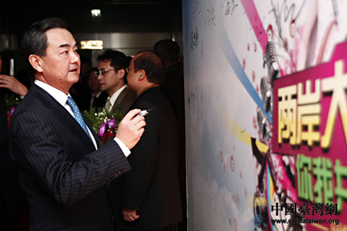 “兩岸大交流 你我共參與”網(wǎng)絡(luò)作品大賽13日在北京舉行頒獎晚會。圖為中臺辦、國臺辦主任王毅在留言板上簽名。(中國臺灣網(wǎng) 田云鵬 攝)