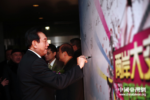 “兩岸大交流 你我共參與”網(wǎng)絡(luò)作品大賽13日在北京舉行頒獎晚會。圖為海協(xié)會會長陳云林留言板上簽名。(中國臺灣網(wǎng) 田云鵬 攝)