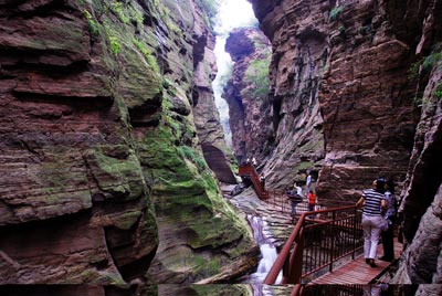 龍潭大峽谷是一條由紫紅色石英砂巖經流水追蹤下切形成的U型峽谷,全長12公里,谷內嶂谷、隘谷呈串珠狀分布,云蒸霞蔚,激流飛濺,紅壁綠蔭,懸崖絕壁,不同時期的流水切割、旋蝕,磨痕十分清晰,巨型崩塌巖塊形成的波痕大絕壁國內外罕見。景區的六大自然謎團(水往高處流、佛光羅漢崖、巨人指紋、石上天書、蝴蝶泉、仙人足跡)七大幽潭瀑布(五龍潭、龍涎潭、青龍潭、黑龍潭、臥龍潭、陰陽潭、蘆葦潭)八大自然奇觀(絕世天碑、石上春秋、陰陽潭甕谷、五代波紋石、天崩地裂、通靈巷谷、喜鵲迎賓、銀鏈掛天)令人驚嘆不已,流連忘返。紅巖絕壁,飛瀑幽潭,狹溝深谷,奇石綠蔭,組成世界上罕見的山水畫廊。
