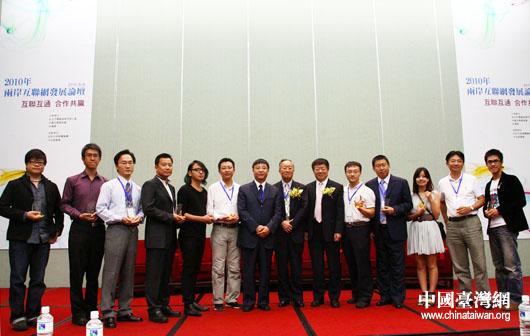 中國臺灣網(wǎng)9月6日臺北消息 6日上午,2010年兩岸互聯(lián)網(wǎng)發(fā)展論壇在臺北市國際會議中心舉行。作為論壇的重要環(huán)節(jié)之一,首屆兩岸互動數(shù)字娛樂設(shè)計大賽在論壇現(xiàn)場隆重頒獎,中國互聯(lián)網(wǎng)協(xié)會副理事長高新民、臺北市計算機公會副總干事黃鋆鋇等為獲獎選手頒發(fā)榮譽獎杯,并與兩岸獲獎企業(yè)與選手親切合影。