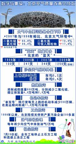 北京的“藍(lán)天”,從1998年的100天增加到2006年的241天,翻了一番多;2007年的“藍(lán)天”數(shù)為246天,比2001年申奧成功當(dāng)年提高了15·6%。今年,北京“藍(lán)天”數(shù)量的目標(biāo)256天,占全年的70%。
