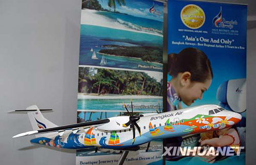 這是8月4日在泰國曼谷拍攝的曼谷航空公司展示的發生事故的ATR72型客機模型。新華社發(塔納攝)