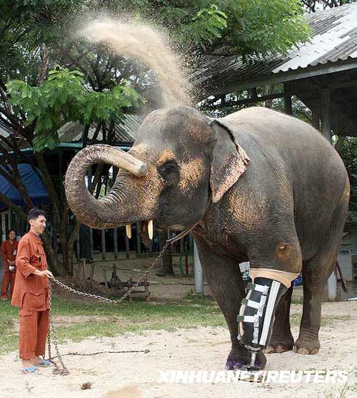 今年48歲的“摩塔拉”1999年在泰國和緬甸邊境密林中運木頭時不幸踩上一枚年代久遠的地雷,在接受左前腿截肢手術兩年后,“摩塔拉”有了一條臨時性以帆布為材料的假肢。專家在“摩塔拉”首次假肢手術中使用了足以放倒70人的麻醉劑,這被載入世界吉尼斯紀錄。