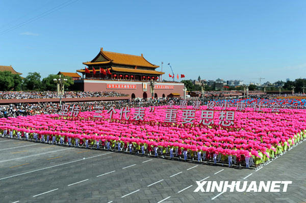 10月1日,首都各界慶祝中華人民共和國成立60周年大會在北京舉行。新華社記者陳樹根攝 這是“與時俱進”標語方陣通過天安門廣場。
