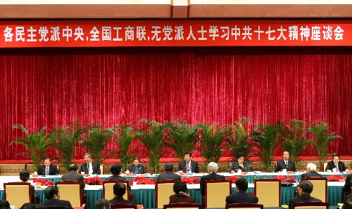 座談會上,民革中央主席何魯麗、民盟中央主席蔣樹聲、民建中央主席成思危、民進中央主席許嘉璐、農(nóng)工黨中央主席蔣正華、致公黨中央主席羅豪才、九三學社中央主席韓啟德、臺盟中央主席林文漪、全國工商聯(lián)主席黃孟復(fù)、無黨派人士陳章良先后發(fā)言。他們暢談了學習中共十七大精神的體會,高度評價了十六大以來我國改革開放和現(xiàn)代化建設(shè)取得的巨大成就,表示要認真學習貫徹好中共十七大精神,自覺接受中國共產(chǎn)黨的領(lǐng)導(dǎo),進一步履行參政議政和民主監(jiān)督職能,堅持走中國特色社會主義政治發(fā)展道路,為奪取全面建設(shè)小康社會新勝利而奮斗。