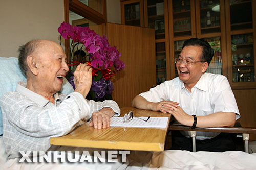資料圖片:2007年8月3日,中共中央政治局常委、國務院總理溫家寶來到錢學森家,看望這位96歲的“國家杰出貢獻科學家”。錢學森是我國航天科學的奠基人之一。 新華社記者 黃敬文攝