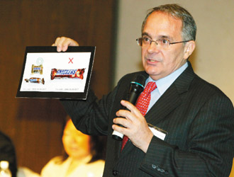 臺灣美國商會執(zhí)行長魏理庭希望未來臺灣地區(qū)能出現(xiàn)不只會操弄民意的領(lǐng)導(dǎo)人,圖為5月底他以進口巧克力,說明臺當局兩岸政策的荒謬。《聯(lián)合報》資料照片
