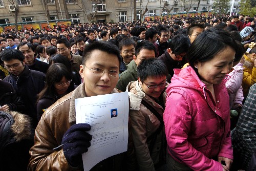 12月9日,在南京林業大學考點參加國家公務員招錄考試的考生們進入考場。當日,2008年中央機關及其直屬機構公務員招錄考試公共科目筆試在全國31個省、市、自治區同時進行。此次考試江蘇省安排了南京主考區和無錫、徐州、揚州3個分考區,共設32個考點,1366個考場,考生總數為38667名,人數創歷年之最。 新華社記者 孫參 攝