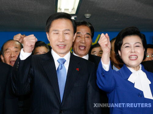 李明博贏得韓國總統選舉 12月19日,在韓國首都首爾的大國家黨總部,大國家黨總統候選人李明博(左)與夫人和支持者們慶祝總統選舉獲勝。韓國中央選舉管理委員會19日晚宣布,李明博當選韓國新一任總統。 新華社/路透